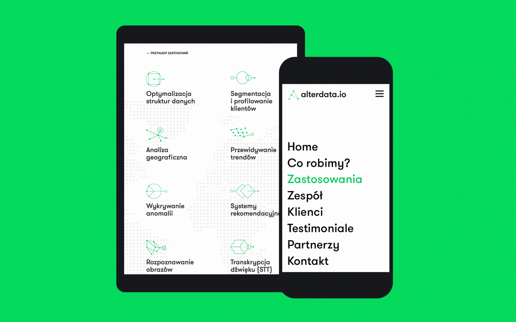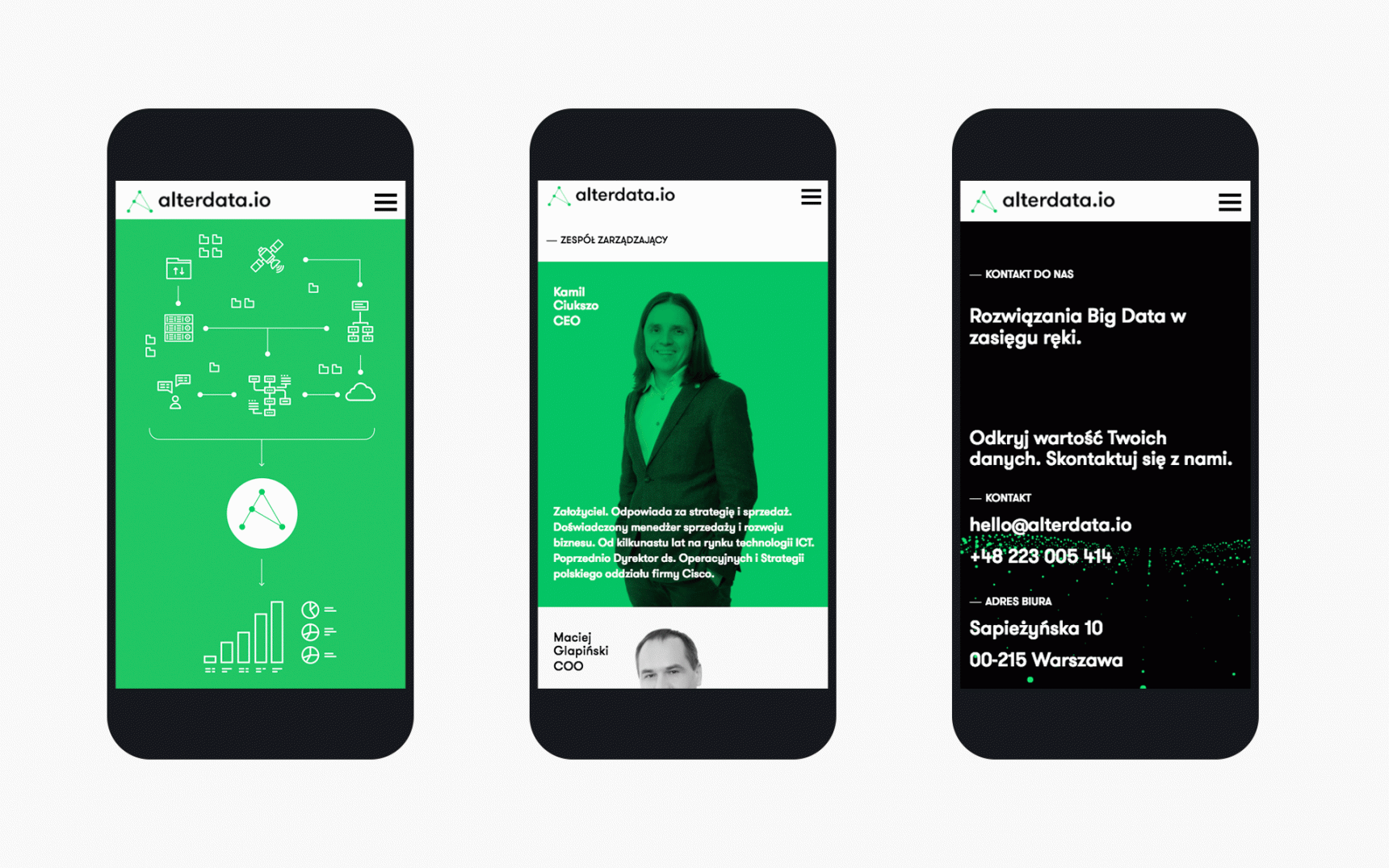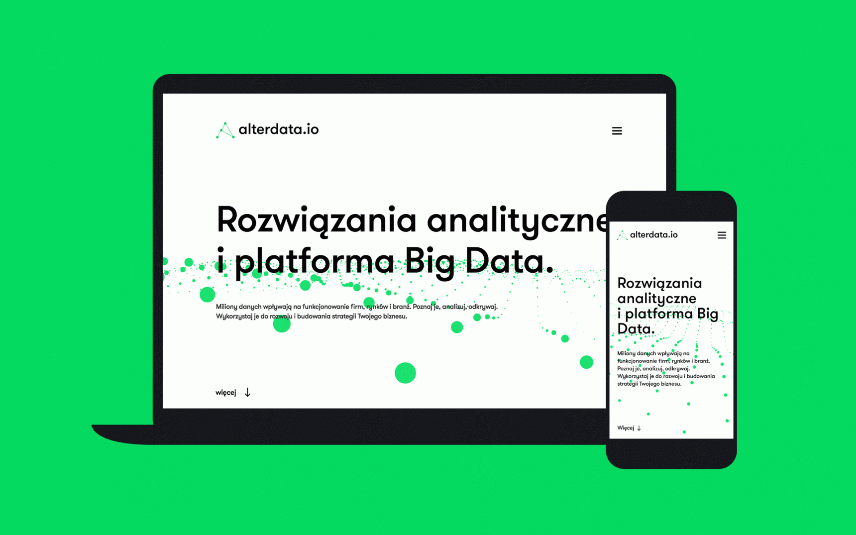 Nasze działania obejmowały również stworzenie projektu serwisu na potrzeby internetu. Powstała strona cechuje się prostą architekturą treści oraz łatwą nawigacją w postaci przewijanego kontentu. Za pomocą wymownych infografik tłumaczymy działalność Alterdata. Całość jest dostosowana do urządzeń mobilnych i została utrzymana w spójnej linii wizualnej marki.