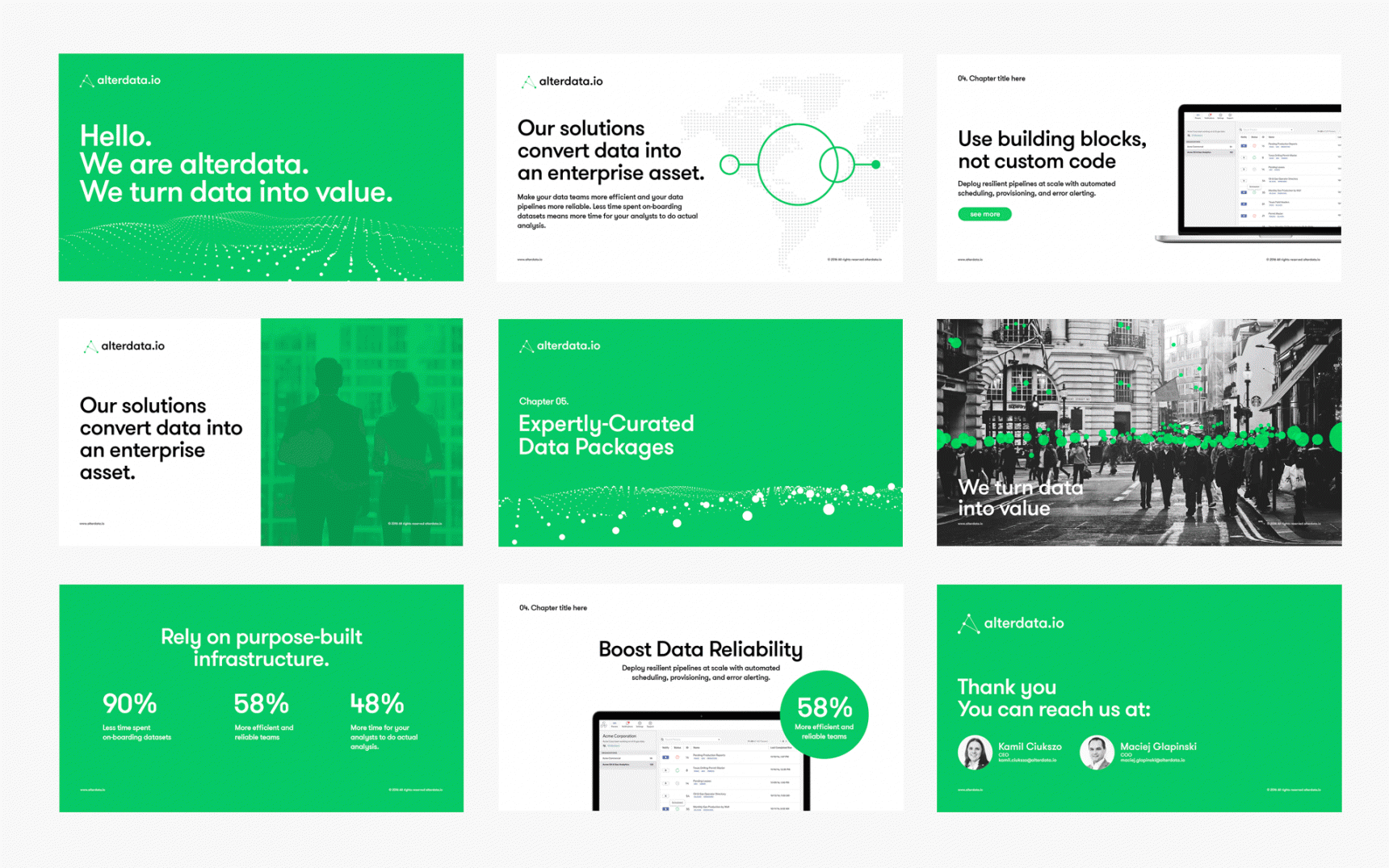 Zostaliśmy zaproszeni do współpracy. Od początku naszych rozmów z klientem najczęściej przewijał się motyw informacji, cyfrowych danych i ich analizy, był to oczywisty i naturalny ‘core’ usług świadczonych przez Alterdata. Postanowiliśmy skupić się na danych jako motywie przewodnim identyfikacji.