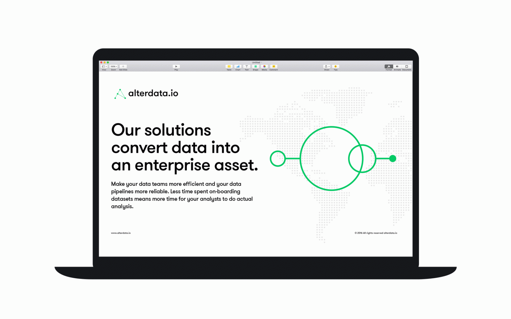 Kulminacją języka komunikacji jest logo, które jest nowoczesną, opartą o syntetyczny język grafiki użytkowej, interpretacją łączenia punktów, stanowiących metaforę informacji, w konkretny wzór. Połączone punkty tworzą sygnet w kształcie litery ‘A’. To czysta kwintesencja działania Alterdata. To dostrzeganie wzorów i ukrytych wartości w pozornym chaosie.